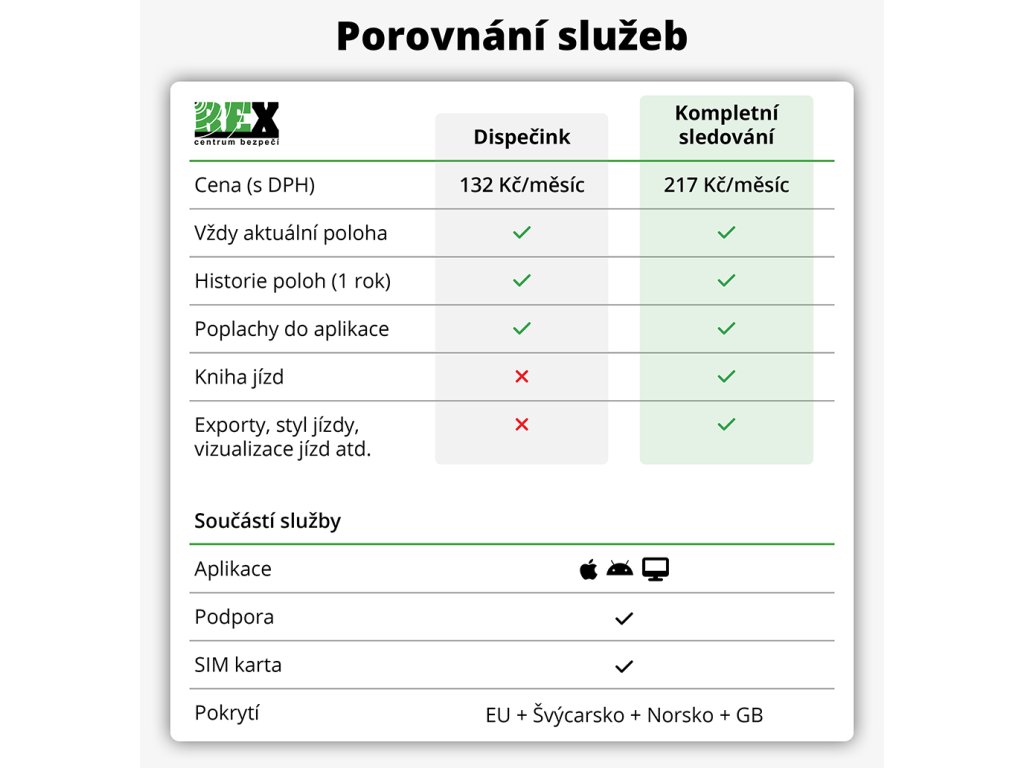 Lokátor sa dodáva so všetkými zahrnutými službami, popis nájdete na karte Porovnanie služieb. Pri zakúpení je v cene zahrnutý jeden mesiac vybranej služby. Za služby sa platí mesačný poplatok (platba na 3-6 mesiacov vopred).